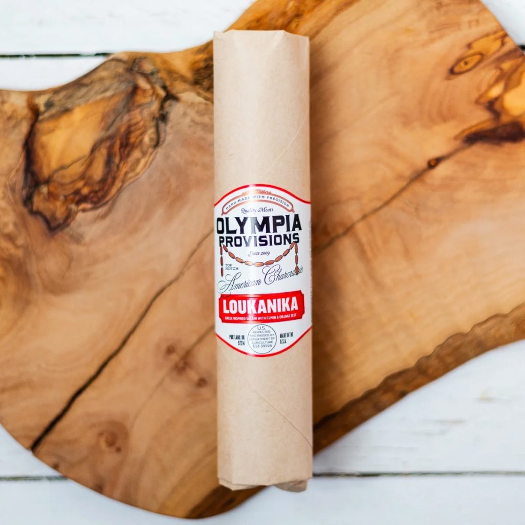 Building on the high quality of the pork, the spicing of the salami is also superb. There’s cumin, garlic, and hints of orange zest—all used to build on an old Cairo family recipe. The Loukanika is naturally fermented (much like a well-made cheese) to slowly develop its flavor, as salami has been matured for millennia now. Like all the Olympia Provisions products—and like all the salami we sell—it has a lively white mold on the outside. This mold is key to fermentation and slow, natural flavor development. When the mold is gone, the salami has almost certainly passed its prime.