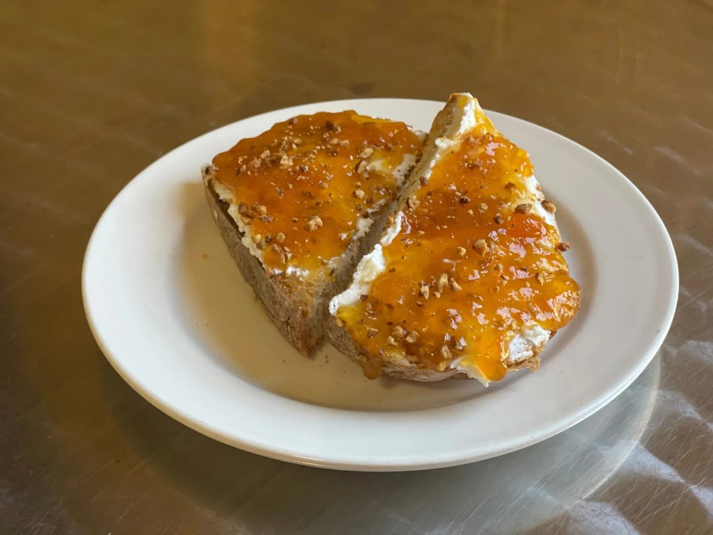 When I first wrote about this terrific toast combination, it was in the context of something you might make at home. A few months later, the Coffee Company crew ran with the idea—they adapted it slightly for their setting and featured it as a special with my name on it. This month, it’s back on the menu, more delicious than ever. Just as important, for me in the moment, it puts apricots front and center. The combination of nicely toasted Bakehouse Farm Bread, Zingerman’s Cream Cheese, apricot jam, and Cinnamon Spiced Peanuts from the Candy Manufactory is truly irresistible!