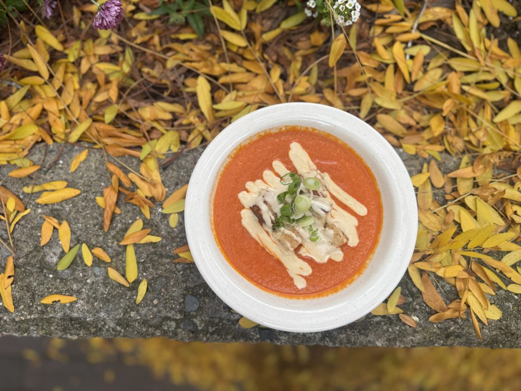 The latest dish to delight diners is this new Creamy Tomato Soup spiced with Korean gochujang chile. The recipe work was done by one of Miss Kim’s skilled cooks, Raunaq. It’s super delicious and wonderfully comforting. You can eat it hot right when you get it or take some home—it will keep in the fridge for four or five days (at least) just fine, and it freezes well, too.