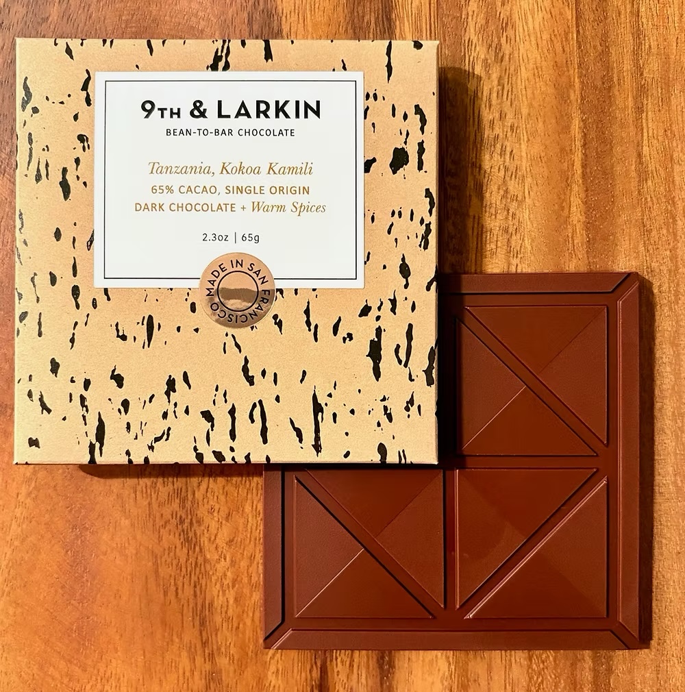 Tanzania: A super juicy and fruity dark chocolate with 65% cacao from the Kokoa Kamili Co-op. In Swahili, “Kamili” means “precision,” which is a good reflection of the quality of the beans that 9th & Larkin buy. The co-op is located in the Kilombero Valley, near the center of the country—a bit north and east from the other terrific Tanzanian chocolate we get from the Mababu Co-op and Shawn Askinosie. Beautifully balanced, with some lovely low notes, complemented by hints of dried raisins and cashews. A couple of folks have noticed a snippet of citrus in the background as well.
