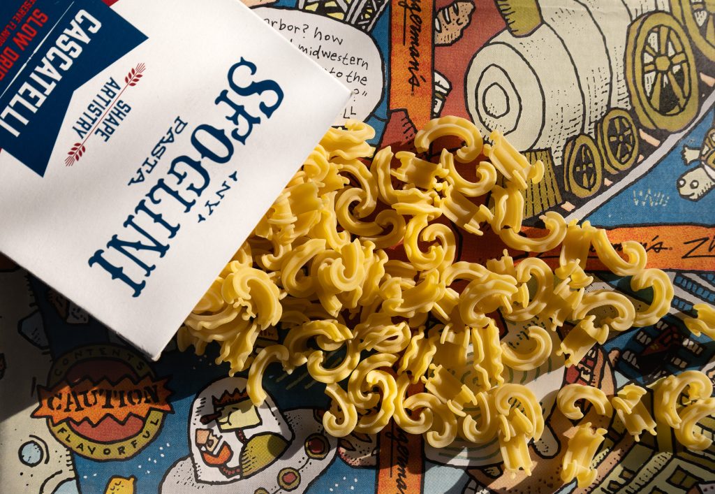 And that’s exactly what Dan did when he created a brand-new pasta shape. It took three years of tinkering, testing, and, presumably, tasting, with the expert pasta makers at Sfoglini to introduce Cascatelli. The name comes from the Italian cascatelle, which means “little waterfalls.” (Dan used a little poetic license to end the name with an “i” instead of an “e” to make it sound more like traditional pasta names.) Dan wasn’t just in it for a fun pasta shape and name; his goal was to create “the perfect pasta,” focusing on three key factors for a noodle that tastes as good as it looks: