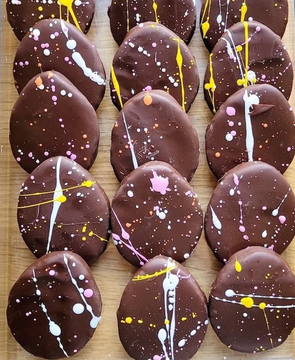About a centimeter thick, peanut butter-filled dark chocolate shells, the “eggs” really are exceptionally delicious. You get the slightly sweet dark flavors of the Guittard chocolate, set off against the slightly savory, terrificness of the St. Laurent Brothers peanut butter from Bay City inside. A small bit of sea salt takes the flavor up even further. The eggs are decorated for the holiday by Jamie and the craft crew at the Candy Manufactory!